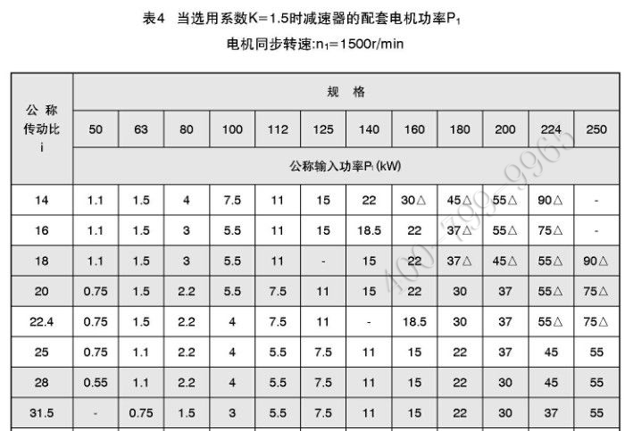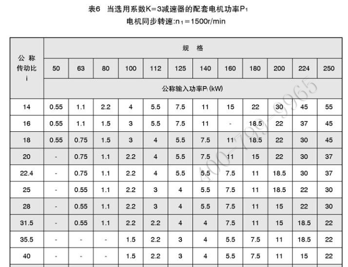 對一般重要程度,選用批量不大,連續(xù)運輸?shù)臏p速器:均勻載荷K=1.5:中等沖擊載荷K=2;強沖擊載荷K=3。確定選用系數(shù)K,根據(jù)輸入電機功率和要求的傳動比i,從表4、5、6中選定減速器。