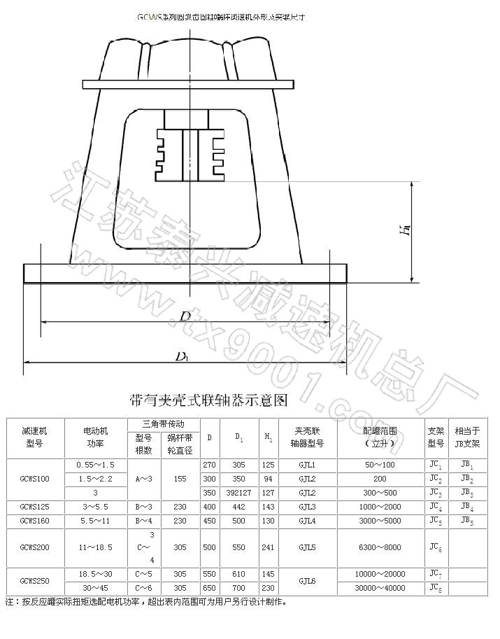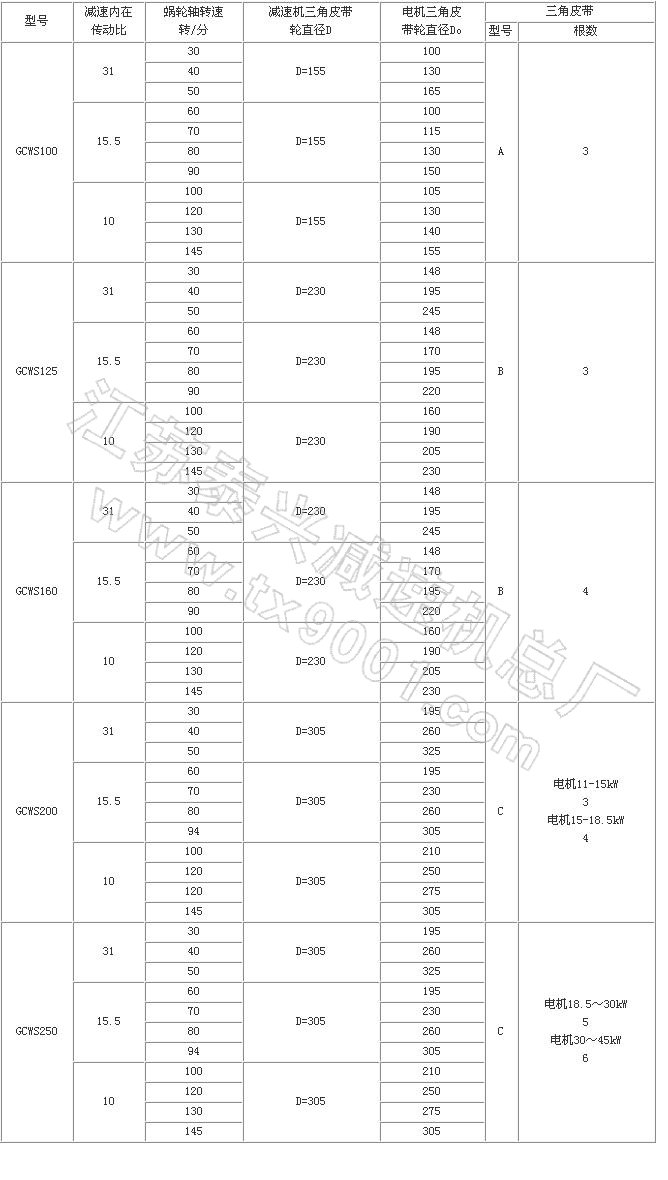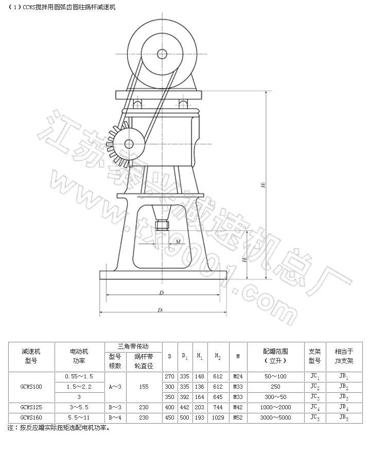 GCWS系列蝸桿減速機采用了軸截面為圓弧形的圓柱蝸桿,蝸輪齒形為與蝸桿相共軛的圓弧,故凸凹嚙合。具有性能可靠,承載能力強,體積小,噪聲低, 運轉(zhuǎn)平穩(wěn),效率高,密封好等優(yōu)點。主要配套安裝于化工、制藥、造紙、釀酒等容器上作傳動攪拌用。特別與搪玻璃反應罐配套安裝,由于設計采用了直徑較大的蝸 輪軸,并加長了該軸的兩上軸承支撐點距離,改變了原來靠通用支架聯(lián)接三軸一體的傳動攪拌形式為減速機與攪拌器直聯(lián)一體的傳動攪拌形式。從而比同類產(chǎn)品體積 小1/3,承載能力強0.5-1.5倍,傳動效率提高10%-20%。