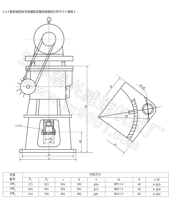 該減速機與攪拌器聯(lián)接形式有兩種:一種是內(nèi),外錐體加螺紋的直聯(lián)型,另一種是立式夾殼式聯(lián)軸器。